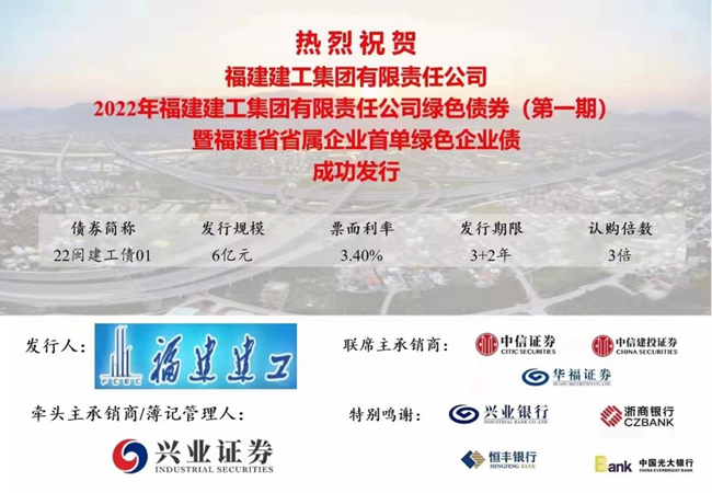 4月11日,由兴业证券牵头主承销的“2022年福建建工集团有限责任公司绿色债券(第一期)”成功发行,这是福建建工集团首单企业债,同时也是福建省省属企业首单绿色企业债。项目募集资金规模6亿元,票面利率3.40%,创同主体评级、同期限结构企业债市场发行利率新低。
