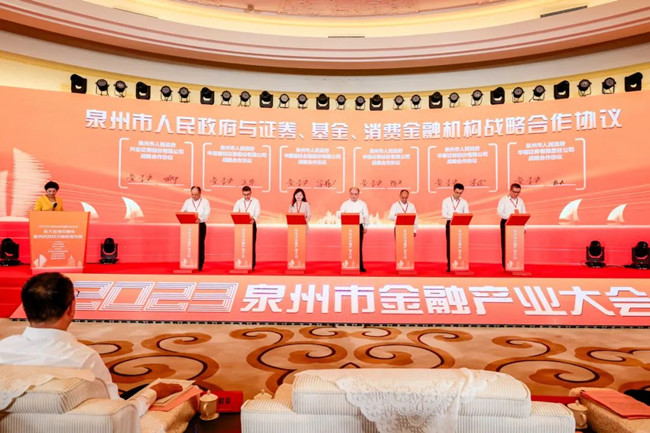 9月22日,以“做大做强金融业,服务民营经济高质量发展”为主题的2023泉州市金融产业大会隆重召开,来自政府部门、监管单位、交易所有关领导以及近300位金融机构和企业家代表齐聚一堂,共谋金融产业发展大计。福建省政协副主席、省工商联主席王光远出席并发表讲话,中共泉州市委书记张毅恭致辞,泉州市人民政府市长蔡战胜主持会议。兴业证券与泉州市人民政府在大会期间签署战略合作协议,共同推进泉州地区多层次资本市场健康发展,助力泉州全方位推进高质量发展。泉州市常务副市长黄景春与兴业证券党委副书记、总裁刘志辉代表双方签署战略合作协议。