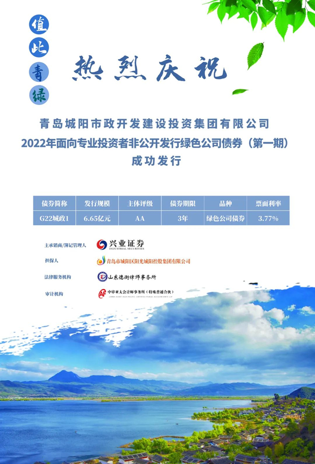 6月6日,由兴业证券独立主承的青岛城阳市政开发建设投资集团有限公司2022年面向专业投资者非公开发行绿色公司债券(第一期)成功发行。该项目既是青岛市城阳区首单绿色债券,同时也是兴业证券主承的山东省首单绿色债券。