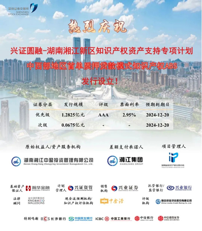 3月22日,湖南湘江新区知识产权证券化项目“兴证圆融-湖南湘江新区知识产权资产支持专项计划”成功在深圳证券交易所发行设立,发行规模1.35亿元。该项目是兴业证券助力湖南省湘江新区发行的中西部地区首单质押贷款模式知识产权abs,标志着全国第一单民营担保机构担保的知识产权证券化产品成功落地。