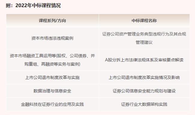 日前,中国证券业协会发布2022年协会远程培训课程开发中标结果,兴业证券本次共有5门课程中标,分别来自合规管理部、投行内核管理部、投行质量控制部、信息技术部及金融科技部。这是兴业证券自2016年成功入围该项目后,连续第七年中标,中标课程数量持续位居行业前列,充分体现了协会及行业专家们对公司专业水平的认可与肯定。