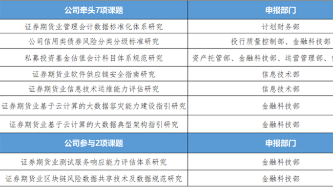 兴业证券接到通知后积极响应,迅速组织公司各单位进行研究申报,信息技术部、金融科技部、计划财务部、资产托管部、投行质量控制部、运营管理部报送七项课题,经过激烈的答辩和角逐,最终全部入选并顺利成为牵头单位。