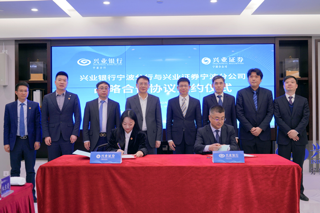 2月21日,兴业证券宁波分公司与兴业银行宁波分行在宁波续签全面战略合作协议。兴业证券董事长杨华辉、兴业银行宁波分行行长斯国庆出席签约仪式并见签。宁波分公司副总经理赵霄雁与兴业银行宁波分行副行长周晓波代表双方签约。