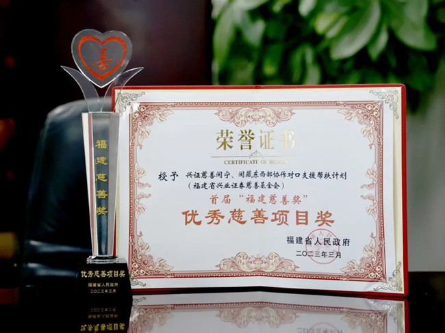作为证券行业唯一代表,兴业证券依托兴业证券慈善基金会设立的“兴证慈善闽宁、闽藏东西部协作对口支援帮扶计划”获得首届“福建慈善奖”优秀慈善项目奖,彰显了社会各界对兴业证券、兴业证券慈善基金会多年来切实履行社会责任的高度肯定。