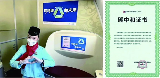 本次航班选用更高燃效、更低能耗、更低噪音的环保飞机波音787-8机型执飞,通过优化飞行轨迹、减轻机上重量、减少apu使用、减少塑料制品等举措,降低航班的温室气体排放;并选用等量的国家核证减排量(ccer)注销,抵消本次航班排放的二氧化碳,达到相对零排放,实现航班碳中和。海峡环交积极参与并推动相关工作,委托中国质量认证中心福州分中心对本次航班排放量进行核算,协调ccer产品的划转与注销,并向厦门航空颁发“碳中和证书”。