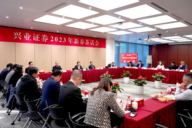 1月30日,兴业证券集团举行2023年新春茶话会,公司领导和集团各单位负责人欢聚一堂,喜迎兔年新春。杨华辉董事长以及刘志辉总裁和王仁渠主席向集团全体干部员工致以新春的问候,对大家过去一年为集团发展所做出的贡献表示衷心的感谢,并勉励大家在新的一年里再接再厉,确保新年开好局、起好步,以奋斗之姿加快建设一流证券金融集团。