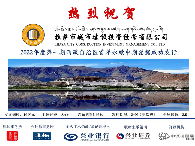 7月12日,由兴业证券与兴业银行联席承销的拉萨市城市建设投资经营有限公司2022年度第一期中期票据成功簿记,发行金额10亿元,票面利率3.66%,全场倍数3.8倍,取得了理想的发行结果。