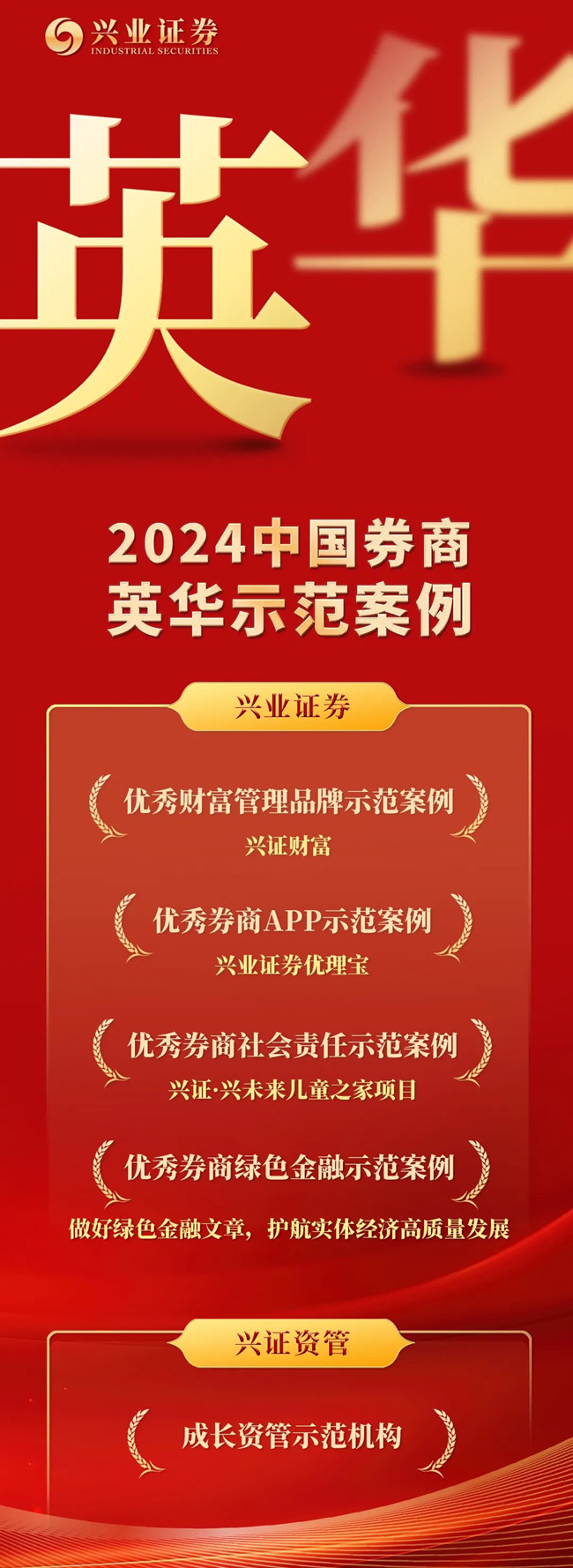 在财富管理领域,兴证财富获评“优秀财富管理品牌示范案例”;在金融科技领域,兴业证券优理宝获评“优秀券商app示范案例”;在社会责任领域,“兴证·兴未来儿童之家项目”获评“优秀券商社会责任示范案例”;在绿色金融领域,“做好绿色金融文章,护航实体经济高质量发展”获评“优秀券商绿色金融示范案例”;在资产管理领域,兴证资管获评“成长资管示范机构”。