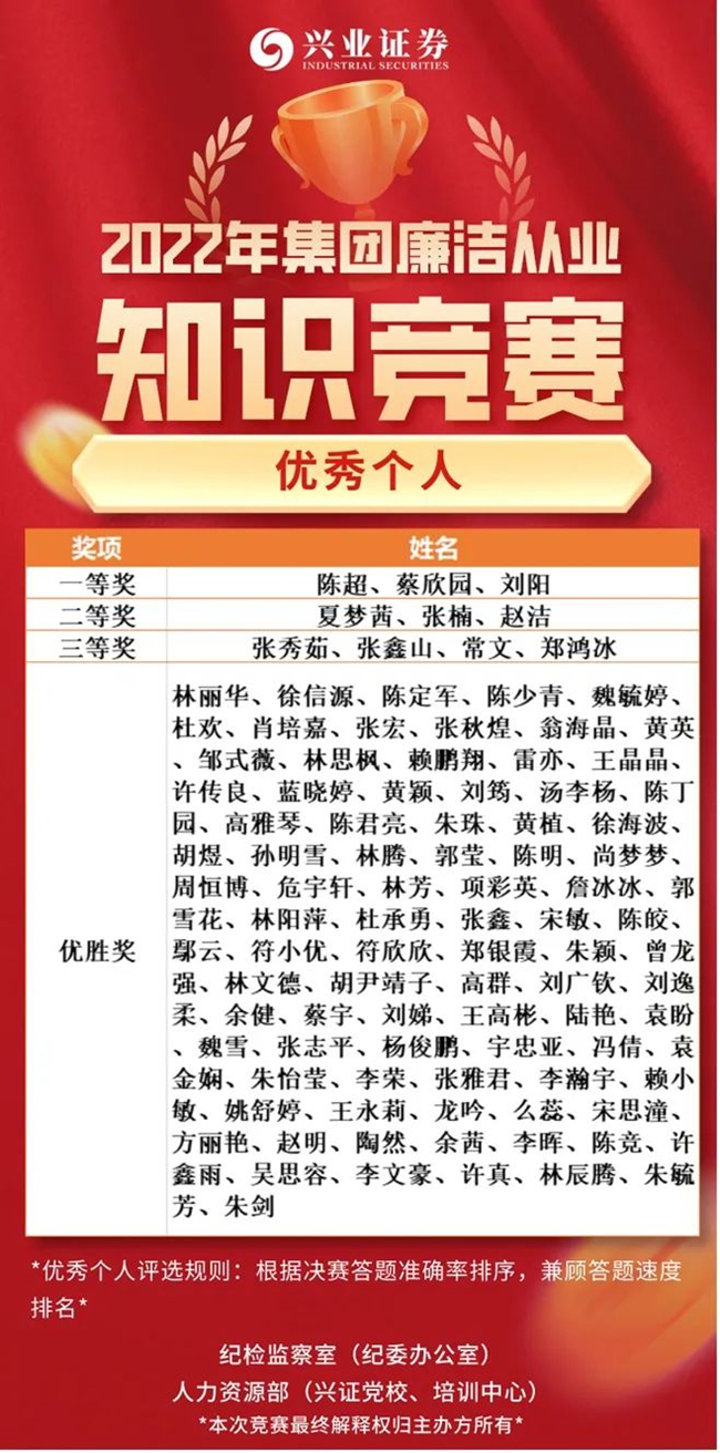 为认真贯彻落实中央《关于加强新时代廉洁文化建设的意见》,大力开展“兴证新风、清廉企业”廉洁文化教育活动,迎接党的二十大胜利召开,兴业证券于9月1日至8日举办2022年廉洁从业知识竞赛,8200多人参加竞赛。