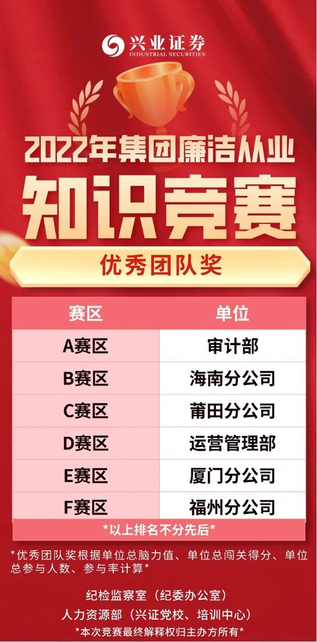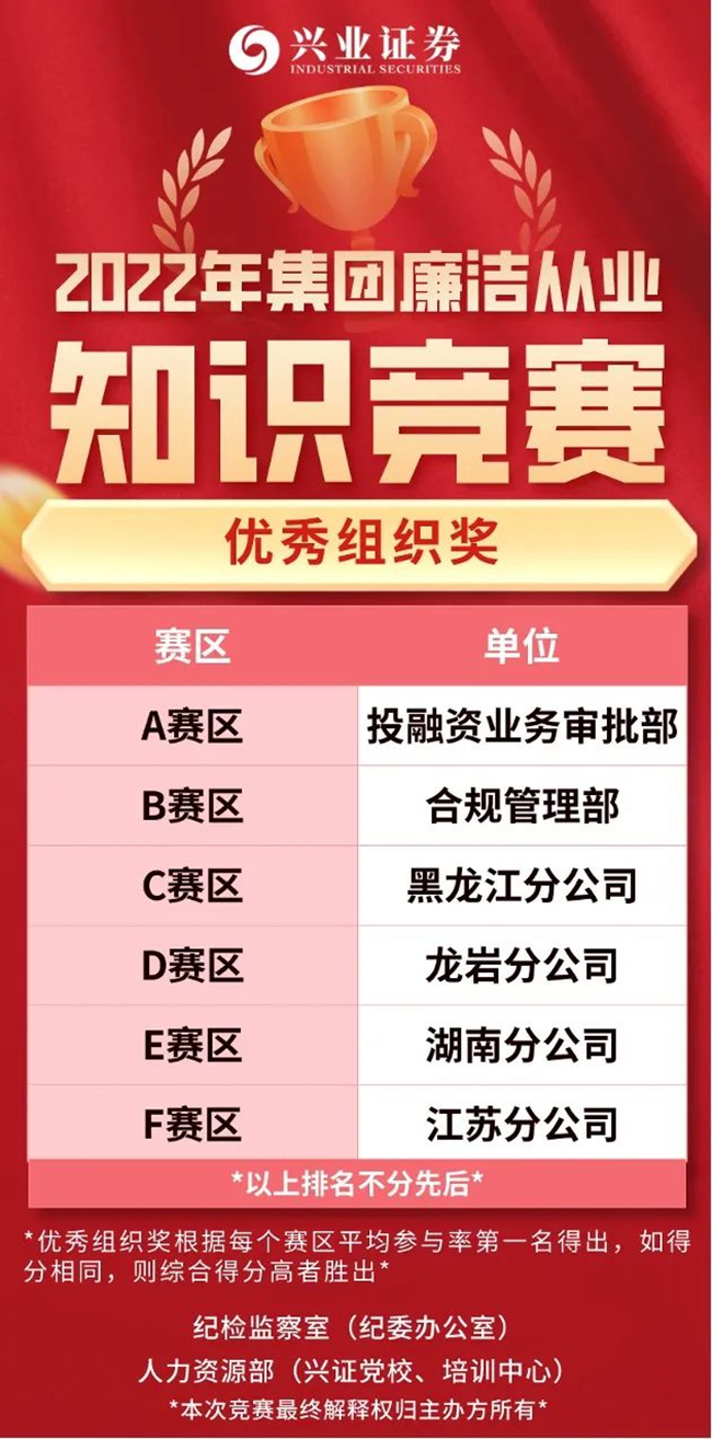 竞赛根据各单位所辖员工数量分为6个赛区,于兴业证券在线学习平台“兴智荟”进行,各单位高度重视、精心组织,广大员工踊跃参与、奋勇争先,通过答题闯关、一站到底等员工喜闻乐见形式,营造浓厚的比学赶超氛围,达到以赛促学、以学促廉的效果。经过激烈练习赛,审计部、海南分公司、莆田分公司、运营管理部、厦门分公司、福州分公司荣获“优秀团队奖”,投融资业务审批部、合规管理部、黑龙江分公司、龙岩分公司、湖南分公司、江苏分公司荣获“优秀组织奖”。
