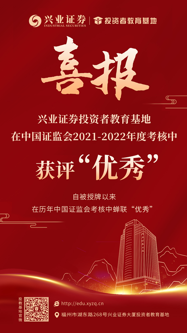 6月24日,中国证监会投保局公布全国证券期货投资者教育基地2021-2022年度考核结果,兴业证券投教基地蝉联“优秀”评级。这是自获国家级投教基地授牌并接受考评以来,兴业证券投教基地连续第4次获“优秀”评级,为兴业证券积极克服疫情困难、践行投资者保护的企业社会责任写下有力注脚。